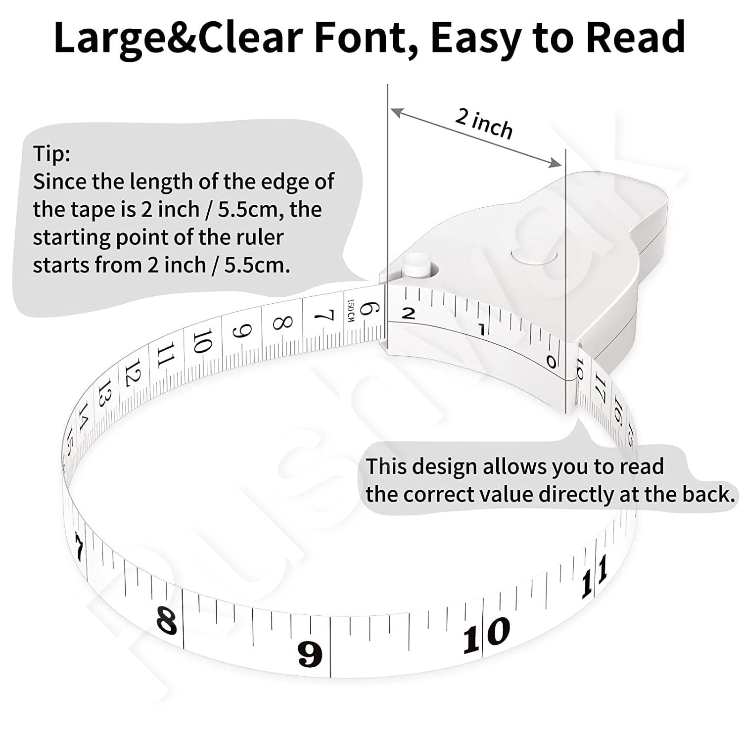 - BODY INCH TAPE : Measures up to 60 inches in length (150cm), since the width of handle is 2 inch/5 cm, the starting value of measurement is at 2 inch/5 cm. Rushwak inchitapes simplify the measuring process. Attention that it’s not start from ZERO.