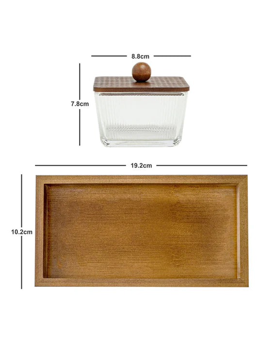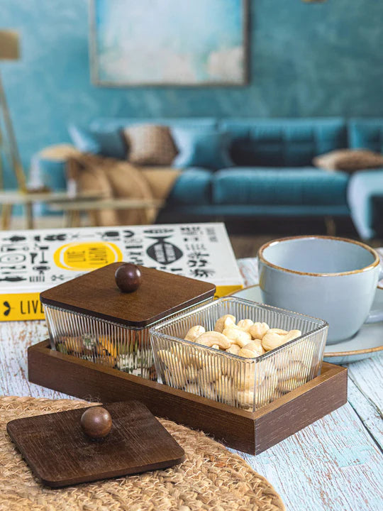 A stylish 2-piece serving set with wooden trays and 250 ml glass bowls with lids. Perfect for dry fruits, mouth fresheners, mukhwas, or condiments, combining elegance with practicality.