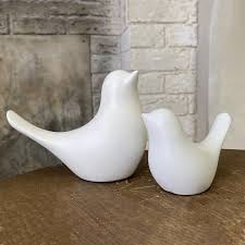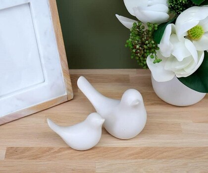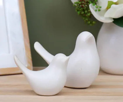A pair of elegantly crafted ceramic sparrow sculptures. Perfect for adding a touch of sophistication and charm to your home décor.